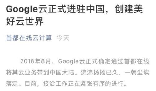 昨日,“首都在線云計算”公眾號發布消息稱,Google 云正式確定通過首都在線將其云業務帶到中國大陸,目前接洽工作正在緊張有序的進行。按照公眾號文字內容來看,其實雙方的合作在 8 月就已落地,但遲遲未對外公布。截至雷鋒網發稿,該微信文已經刪除。