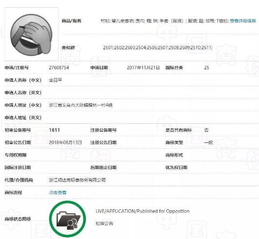 從初審公告上我們可以看到,「捂臉」表情注冊的只是服裝鞋帽等25類商品,我們知道,商標分類注冊是按核定圖樣核定使用商品保護。