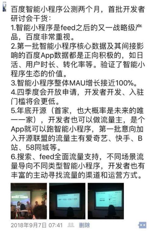 另一面,百度也不甘下風,在9月6日,百度舉辦了一次關于百度智能小程序的閉門會議,總經理平曉黎在該場閉門會議上,向開發者透露了百度智能小程序的關鍵數據,相關截圖,討論內容也已經流出,各項數據也均讓人側目。