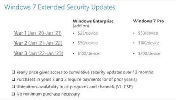 隨著時間的推移,價格每年按照翻一番的速度調整。換言之,2022年到2023年需要100美元/設備或者200美元/設備(Win7專業版)。
