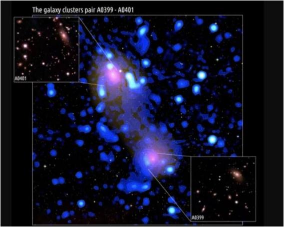 “阿貝爾0399”和“阿貝爾0401”距離地球大約10億光年,是兩個(gè)相鄰的星系團(tuán),星系團(tuán)是有數(shù)百乃至數(shù)千個(gè)星系在引力作用下聚集在一起形成的集合體。在未來(lái)的數(shù)十億年內(nèi),這兩個(gè)巨大的龐然大物將有可能發(fā)生碰撞。目前這兩者之間距離大約1000萬(wàn)光年,由前文提到的一道長(zhǎng)長(zhǎng)的等離子體橋梁連接。