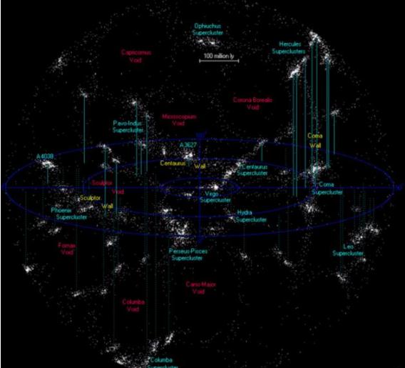 如果星系群是宇宙中的城市,那么“纖維”就像連接城市之間的高速公里。這幅圖展示的是距離地球周圍5億光年內(nèi)所有已知的星系群分布情況(注意:阿貝爾0399和阿貝爾0401不在其中)