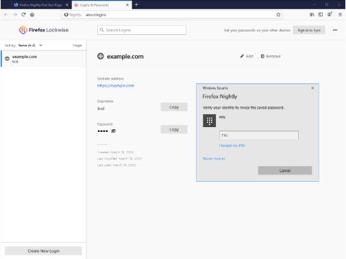目前該功能已在 Firefox 76 Nightly 版本中可用。Firefox 會彈出一個要求輸入 Windows 密碼或 PIN 碼的對話框,諸如顯示密碼、復制密碼或編輯密碼之類的請求都會產生提示。
