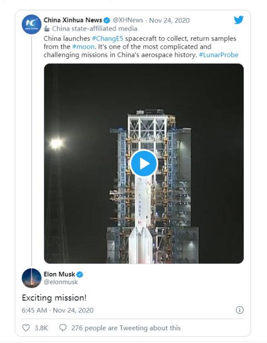 馬斯克在推文中回應了中國媒體的報道,并贊揚了中國最新的登月努力。他說,嫦娥五號發射是“令人興奮的任務”。