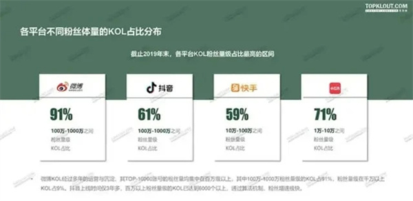 首先,腰部KOC把控著小紅書絕大部分聲音,導致小紅書無法孵化出薇婭、李佳琦、辛巴、羅永浩這種頂流KOL。據統計,微博和抖音KOL的粉絲量級都是100-1000萬之間的級別為主;快手KOL以10-100萬之間的粉絲量級為主。