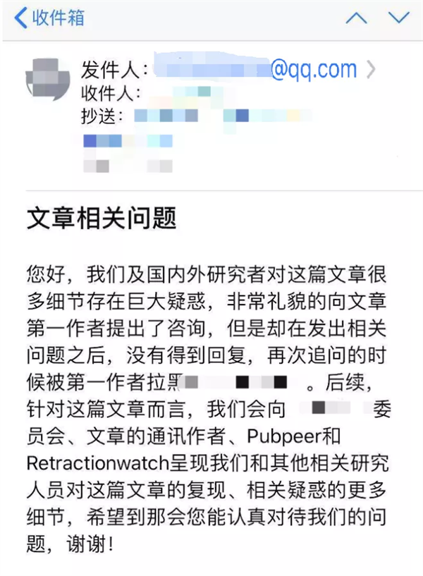 沒想到,稍晚時(shí)候,我竟然又收到了匿名者郵件,他帶著威脅地聲稱——文章有著疑點(diǎn),“非常有禮貌” 地詢問了我的學(xué)生,卻被拉黑了(見圖2)。