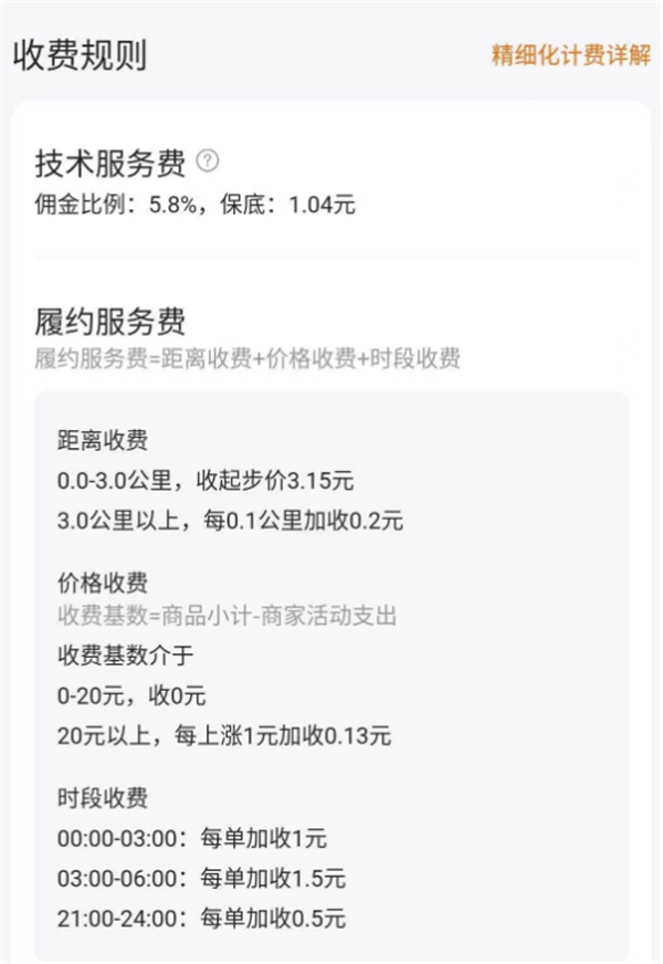 前幾天美團(tuán)把對(duì)商戶的費(fèi)率進(jìn)行了更改,把原來的固定的傭金拆分為較低的技術(shù)服務(wù)費(fèi)和履約服務(wù)費(fèi)。對(duì)于3公里以上的訂單和深夜凌晨等特殊時(shí)段,又采用了階梯式收費(fèi)。