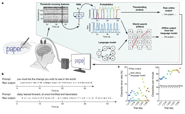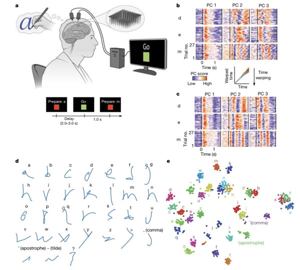 北京時間5月12日晚間,頂級學術期刊《自然》(Nature)以封面文章的形式刊發(fā)了由斯坦福大學、布朗大學、哈佛醫(yī)學院等團隊的研究人員聯(lián)合完成的一項里程碑式研究,題為“High-performance brain-to-text communication via handwriting”。該研究回歸到古老的表達自方式——手寫,首次解碼了與書寫有關的神經(jīng)信號,并實時顯示它們。