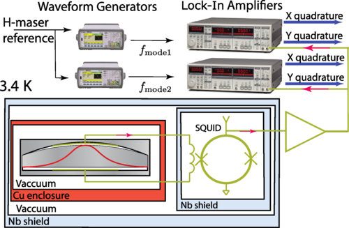 BAW 裝置被連接到一個(gè)被稱為 SQUID 的超導(dǎo)量子干涉裝置上,該裝置對(duì)來(lái)自石英 BAW 的低電壓信號(hào)起著極其敏感的放大器作用。這個(gè)組件被放置在多個(gè)輻射防護(hù)罩中,以保護(hù)其不受雜散電磁場(chǎng)的影響,并被冷卻到低溫,以便在 SQUID 放大器的幫助下將石英晶體的低能量聲波振動(dòng)檢測(cè)為大電壓。