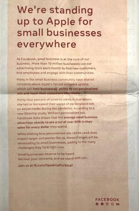 愛范兒曾寫過,《金融時報》的一項調查發現,自從今年 4 月蘋果開始實行新的隱私設置,Facebook 等四大社交平臺損失近百億美元。2020 年 12 月,Facebook 曾用整版報紙廣告批評這項隱私設置,認為它將傷害依賴個性化廣告的小型企業。