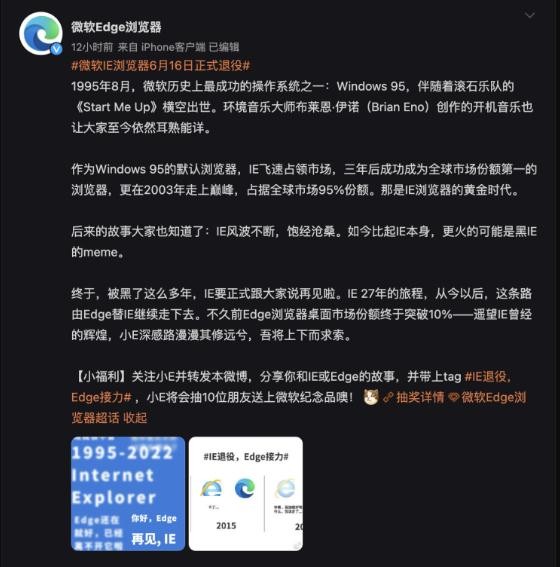 微軟 Edge 瀏覽器官微發文提醒微軟 IE 瀏覽器將于 6 月 16 日正式退役,并稱被黑了這么多年,IE 要正式跟大家說再見啦。從今以后,這條路由 Edge 替 IE 繼續走下去。