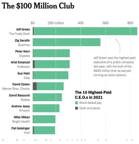 2021 年,美國收入最高的 10 位 CEO 的薪酬全部超過了 1 億美元,這在歷史上是第一次。他們的平均薪酬為 3.3 億美元,也創下了有史以來的最高。在他們的薪酬中,股票獎勵占據了絕大部分。