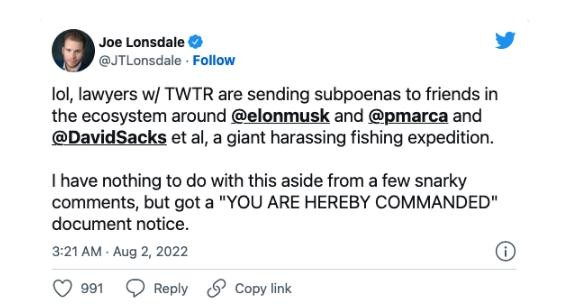 上周,曾與馬斯克在 5 月份一起出席 All-In 峰會的投資者喬?朗斯代爾 (Joe Lonsdale) 在推特上稱,傳票是一次“巨大的騷擾性非法調(diào)查”。