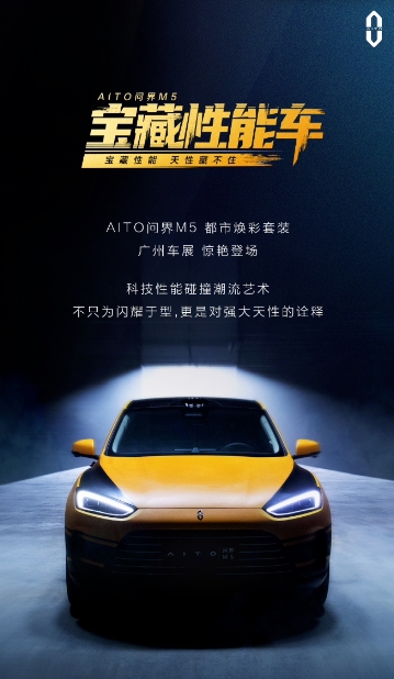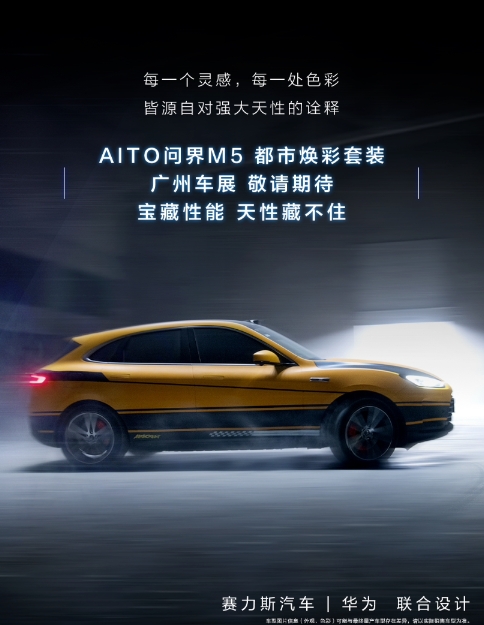 華為和賽力斯聯合設計的 AITO 問界 M5 汽車今日公布了“都市煥彩套裝”,將于廣州車展正式發布。