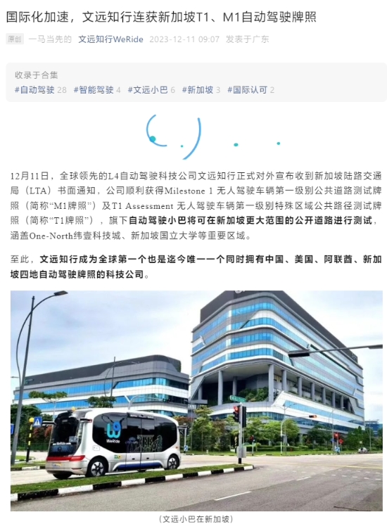 文遠(yuǎn)知行獲新加坡 T1、M1 自動(dòng)駕駛牌照,取得同類公司當(dāng)?shù)刈羁臁澳门啤奔o(jì)錄 10:02:32