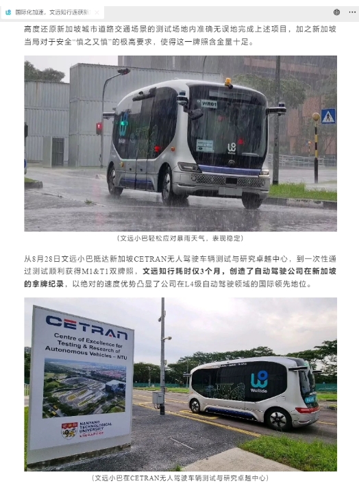 據(jù)介紹,文遠(yuǎn)小巴 8 月 28 日抵達(dá)新加坡 CETRAN 無人駕駛車輛測(cè)試與研究卓越中心。此次該公司一次性通過測(cè)試并拿到雙牌照,耗時(shí) 3 個(gè)月,號(hào)稱創(chuàng)造了自動(dòng)駕駛公司在新加坡的拿牌記錄。