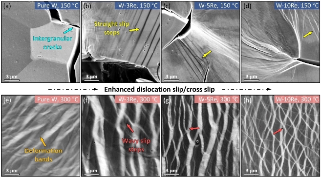 研究人員發(fā)現(xiàn) Re 合金化引起的有限韌化僅發(fā)生在很窄的低溫區(qū)間(50 °C~200 °C)。高溫(≥300 °C)變形時(shí),W-Re 合金的塑性變形能力明顯降低,最終導(dǎo)致合金高溫韌性下降、韌脆轉(zhuǎn)變溫度升高。